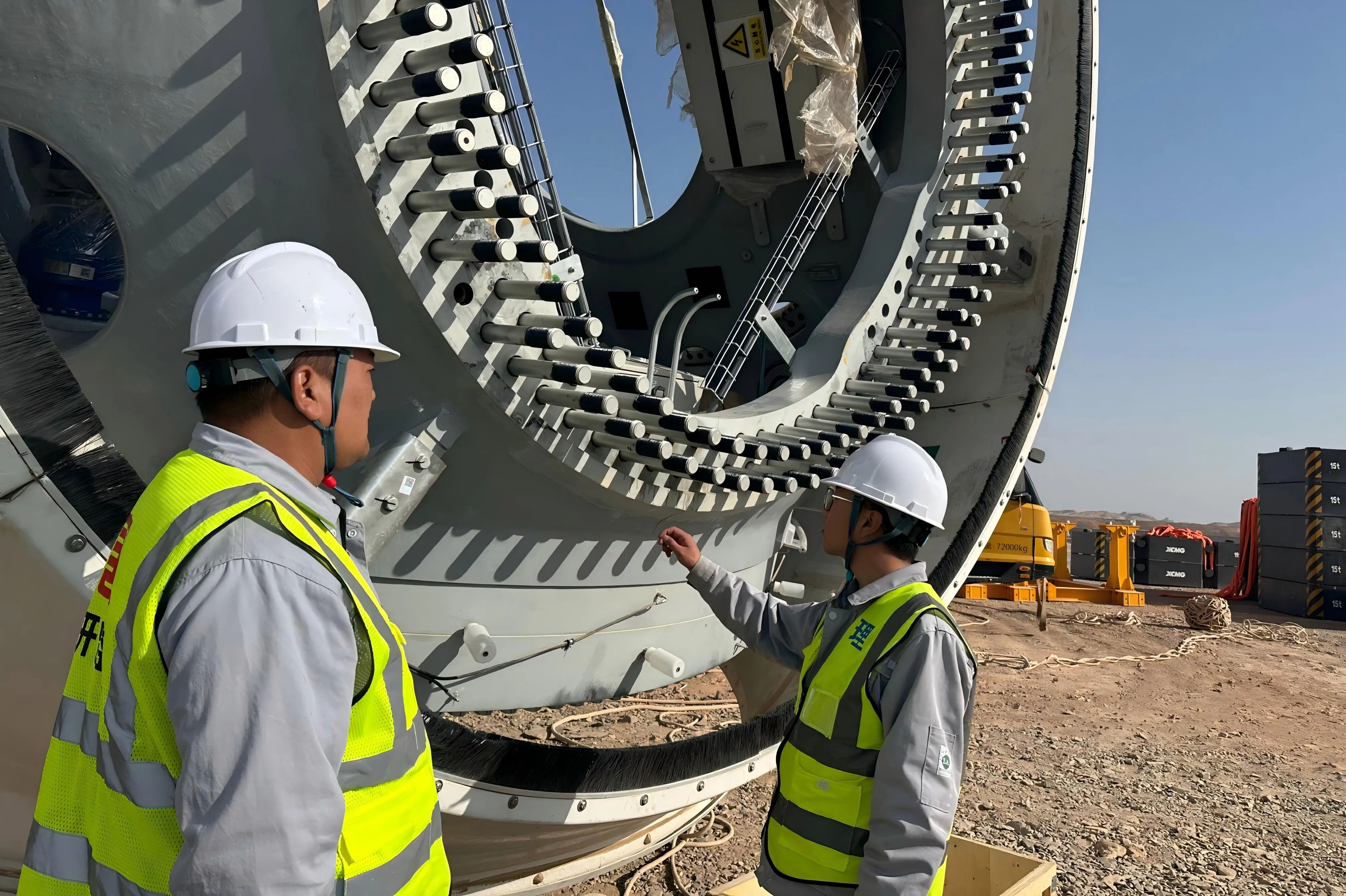 面对该项目地点常年风沙肆虐、昼夜温差大、极端高温频发且干旱缺水、通讯不畅的恶劣环境,华研监理制定风沙防范专项实施细则,重点加强大型吊装作业的风速监测、精密设备安装的防尘覆盖,确保恶劣天气下人员安全、设备完好;严格审核专项施工方案,加密混凝土坍落度、养护温度等现场抽检频次,确保混凝土强度、风机基础质量等均符合设计标准;配备卫星电话、便携式信号增强设备,建立“定时汇报+紧急联络”双机制,确保监理指令传达畅通、现场信息反馈及时;提前制定施工用水储备与循环利用方案,保障用水需求,确保工程按期推进。